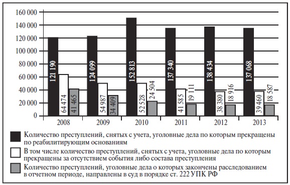Наглядным подтверждением существования организованного сопротивления борьбе с преступностью является ежегодное сокращение количества преступлений, уголовные дела о которых направлены в суд в порядке ст. 222 УПК РФ, и значительный в сравнении с ним рост массива преступлений прошлых лет и снятых с учета преступлений, уголовные дела по которым прекращены по реабилитирующим основаниям (рис. 7).