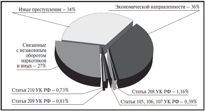 Рис. 3. Структура совершенных участниками ОГ или ПС (ПО) преступлений, уголовные дела о которых направлены в суд в порядке ст. 222 УПК РФ за 2008 г.