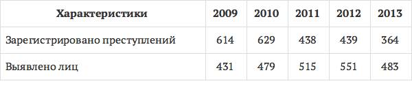 Динамика количества зарегистрированных преступлений, предусмотренных ст. 294, 295, 317 УК РФ, и числа выявленных лиц, их совершивших, за период 2009–2013 гг.
