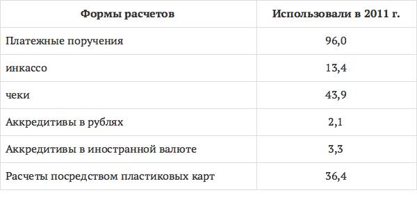 Достаточно популярны расчеты чеками (43,9 %). Они используются тогда, когда плательщику неизвестны номер счета и банк получателя платежа. Однако у данной формы расчетов есть существенный недостаток – высокие издержки оборота. Электронные чеки не смогли полностью исключить данный недостаток, поэтому в развитых странах чеки были вытеснены иными формами расчетов (прямые денежные переводы (жиро) и иные формы электронных безналичных платежей). Некоторые экономисты считают чеки «тупиковой ветвью эволюции платежных средств»97.