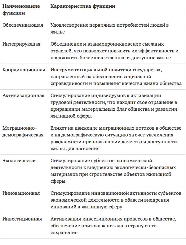 Одна из самых важных функций жилищной сферы – удовлетворение потребностей людей в качественном и доступном жилье. Спектр этих функций с отражением характеристик каждой из них приведен в табл. 1.1.