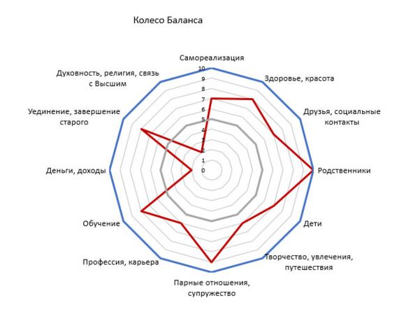 Работа с «Колесом баланса» проводится в начале или в конце года, когда нужно запланировать основные направления развития и события на предстоящие 12 месяцев. Состояние сферы оценивается от 1 до 10, где 1 – наименьшее развитие, 10 – все в полном порядке. Для наглядности точки, полученные на Колесе, можно соединить прямыми (см. рис.) или закрасить сектора разными цветами. Так можно увидеть, насколько Колесо (а значит, и ваша жизнь) гармонично. Покатится ли оно? Это не значит, что все сферы всегда должны быть «на десятку». Они динамичны. Но нужно стремиться к тому, чтобы Колесо было более ровное.