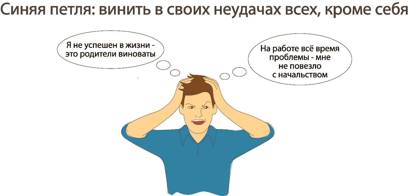 Синяя петля – это модель поведения, когда личность по всем признакам находится на Красной, Желтой, Зеленой, Бирюзовой или Белой ступени пирамиды, но в стрессовой ситуации реализует сценарии поведения, характерные для уровня «Зависимость». В Синей петле человек вместо того, чтобы самостоятельно разобраться в причинах и преодолеть трудности, предпочитает искать защитников-покровителей, которые сделают всю работу за него. Вторая отличительная особенность – склонность обвинять в своих неудачах других людей.