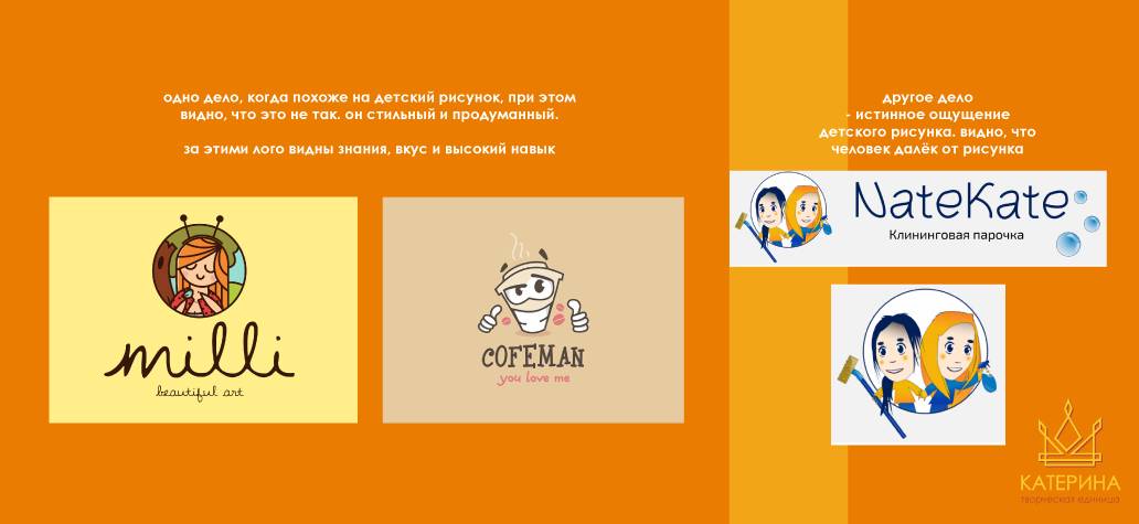 Но. Хочу сделать важную оговорку, навык рисования – какой-то супербазовый (походить на курсы или тренироваться по урокам дома – будет полезно) – поможет вам рисовать логотипы, персонажей, крутые иллюстрации. Если вы делаете только рекламные макеты (или логотипы без персонажей и т.д., с графическими элементами) – то можно и без рисунка. Просто больше практики и насмотренности. Важно развивать свои возможности и вкус. Потому что я натыкалась на дизайнеров, которые видно, что не умеют рисовать, но годами делают ставку именно на продукты, где этот скил важен. И при этом искренне не понимают, почему их работы так мало привлекают клиентов. Я о подобных работах (справа):