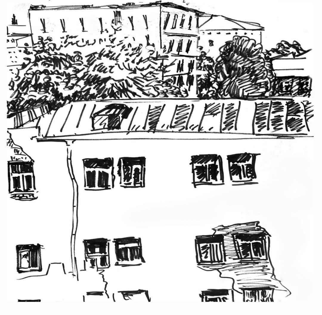 At first, I just drew out of admiration for the view and the contrasts between concrete debris, the wild nature and the profile of a modern city in the background. After several drawings made from the windows of the stairwells of my building, I decided to go down to the ground and walk around these already empty houses with a notebook and a marker, focusing my eyes on the constructivist type elements already familiar to me from literature. The entire territory was surrounded by a high but transparent fence, which, to match the surrounding parks and courtyards of medical institutions, consisted of a steel peaks palisade. The gates were pad-locked, except for one, behind which, in the depths of the yard, sat a fat man in a characteristic sleeveless underwear shirt and an absentminded expression on his face. In this compartment of the yard, viewed from the street, there were several modest (according to Moscow center norms, where every third car is a black Mercedes, and every fifth – Land Rover of some color) cars. Perhaps the man’s job was to keep an eye on those vehicles, or, maybe, he was there to keep potential squatters out. One way or another, he did not sit there all the time, absenting himself for his own needs, so, having seized the right moment, I “leaked” through the gate and further – into the backyard, where the additional design features appeared before me in all the details: such as balconies running along the facade, that connected several residential units like cabins on the middle deck of a passenger steamer, and windows built into the building’s corners.