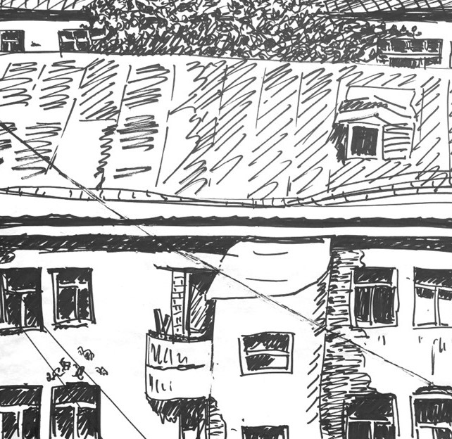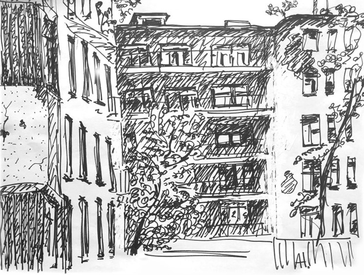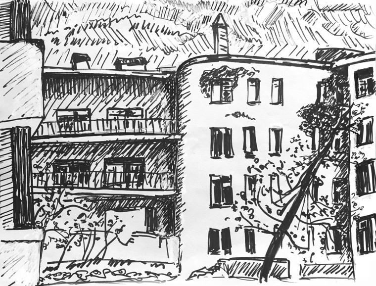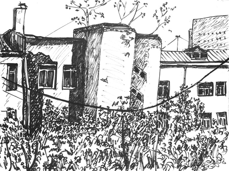 Сначала я рисовал просто так от восхищения открывшимся видом и контрастами бетонных обломков с живой природой и профилем современного города на заднем плане. Когда рисунков, сделанных из окон лестничных клеток моего дома накопилось побольше, я решил спуститься на землю и обойти эти уже пустующие дома с блокнотом и маркером, сфокусировав взгляд на уже знакомых из литературы элементах конструктивистских построек. Вся территория была обнесена высоким, но прозрачным забором, состоявшим, под стать окружающем паркам и дворам медицинских учреждений, из частокола стальных пик. Немногочисленные калитки были заперты на висячие замки. Кроме одной, за которой в глубине двора сидел полный человек в характерной майке без рукавов и с отсутствующим выражением лица. В этом, просматриваемом с улицы отсеке двора стояло несколько скромных (по московским понятиям, где каждая третья машина черный Мерседес, а каждая пятая Лэндровер какого-нибудь цвета) автомобилей. Возможно, работа сторожа состояла в присмотре за этими машинами, а, может, он был здесь, чтобы не пускать потенциальных скваттеров. Так или иначе, сидел он там не всё время, отлучаясь по своим надобностям, так что, улучив подходящий момент, я просочился, через калитку и дальше – на задний двор, где новые черты конструкции предстали предо мною во всех подробностях. Здесь открылись другие известные приёмы конструктивистского дизайна, как-то балконы, бегущие вдоль фасада, и соединяющие несколько жилых единиц наподобие кают средней палубы пассажирского парохода, и окна, встроенные в угол дома.