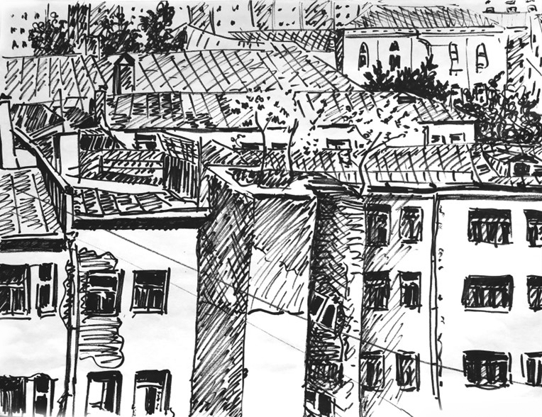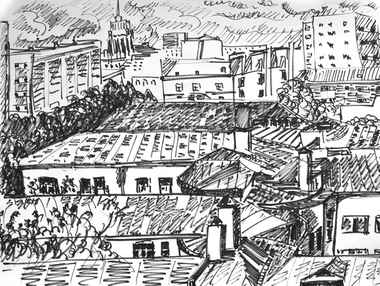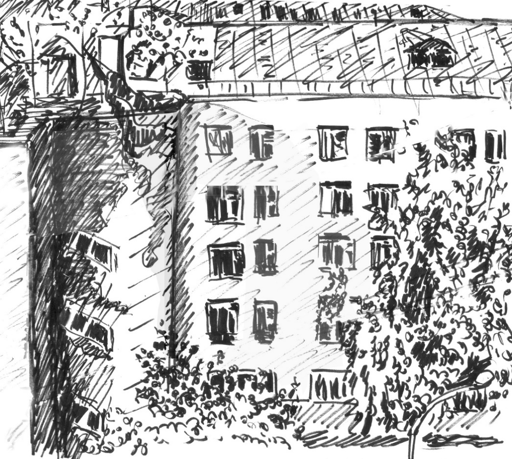After a binge hour of drawing my favorite subjects, I finally looked around and found behind and around me many cars of the same ordinary kind. They were parked right on the grassy rubble courtyard, all of them having parking permit tags hanging on the rear-view mirrors. Their number exceeded expectations with the obvious emptiness of the concrete ruins, but it could well have matched the needs of the residents of the erected more recently, ten-story building, which was located at the far edge of the surrounded by a common fence territory, Probably, that building belonged to the same institution. In addition, I noticed a couple of the owners who might have thought that my presence and, most importantly, behavior (writes and draws something in a notebook) was a violation of the established order. Thus, they could have come up with who knows what conclusions not in my favor. One way or another, it was necessary to think about an orderly retreat. As I wasn’t looking forward to explaining myself to the fat man in the T-shirt who in the meantime returned to his post, I cowardly slipped away through the bushes to the exit that opened from the side of the new building in order to let the next legitimate client into the parking lot. Once again on the street, I rushed away. In fact, there was nothing else for me to do there, except climbing inside one of the concrete wrecks and run through endless corridors with the possible risk of falling through or hanging on a protruding steel rebar. But it hadn’t come to that then, now, and ever…