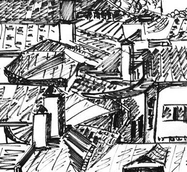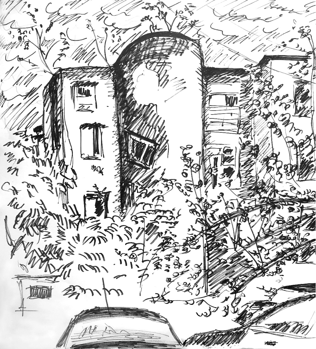 После запойного часа рисования увиденного я, наконец осмотревшись, обнаружил позади и вокруг себя множество запаркованных прямо на поросшем травою щебеночном дворовом покрытии большое число автомобилей того же среднего пошиба с бирками – разрешениями на парковку, подвешенными на зеркалах заднего обзора внутри запертых машин. Количество их превышало ожидания при очевидной пустоте бетонных полу развалин, но вполне могло соответствовать потребностям жильцов десятиэтажного дома, постперестроечного времени, которое помещалось достаточно далеко на краю огороженной общим забором территории, принадлежавшей, по-видимому, тому же ведомству. Потоптавшись ещё на своём пятачке перед домами-призраками, я заметил, что среди запаркованных машин имеются кое какие владельцы, которые, неровен час, могут подумать, что моё присутствие и, главное, поведение (пишет-рисует чего-то в тетрадке) является нарушением порядка с последующими выводами не в мою пользу. Так или иначе необходимо было позаботиться об упорядоченном отступлении. Не желая объясняться с вернувшимся на своё место толстяком в майке, я позорно улизнул через кусты к выходу, открывшемуся со стороны нового дома для того, чтобы пропустить на парковку очередного законного клиента и, оказавшись снова на улице, «сделал ноги». По сути, мне там делать было больше нечего, разве что забраться внутрь какой-либо из бетонных развалюх и пробежаться по бесконечным коридорам с возможным риском провалиться или зависнуть на торчащей арматуре. Но до этого не дошло и не дойдёт теперь уже никогда.