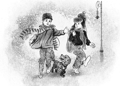 Очень весело прошёл и следующий после возвращения день. Мальчишки взяли щенка на прогулку. Вместе бегали по сугробам. Ребята кидались снежками, а он пытался поймать белые летающие мячики. Когда братья катались на санках с ледяной горки, Малыш носился за ними и смешно падал на разъезжающихся лапах.