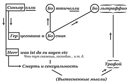 В схеме фамилия Signorelli (Синьорелли) разделена на две части. Одна пара слогов (elli) повторена без изменений в фамилии-подмене (Botticelli). Другая же пара Signor в результате перевода на Herr (оба слова означают «господин») вступает в два неодинаковых отношения со словами, встречающимися в вытесненной теме беседы (Herr и Herzegowina), и в итоге становится недоступной для припоминания. Замена этой части фамилии происходила как бы путем перемещения словосочетания «Герцеговина и Босния» без учета смысла и акустического различия слов. То есть в ходе этого процесса со словами обращались как в графическом изображении некоего высказывания в виде собрания картинок-загадок (ребуса). Об этом процессе в целом, создавшем этими путями вместо фамилии Синьорелли эрзац-фамилии, сознанию ничего не было известно. Соотношение между темой разговора, в которой подспудно присутствовала фамилия Синьорелли, и предшествующей ей вытесненной темой, которая ограничилась повторением одних и тех же слогов (точнее, сходной последовательности букв), выглядит поначалу недоступным выяснению.