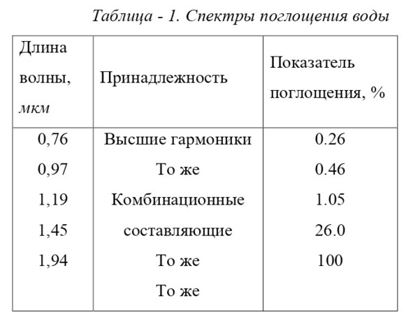 В таблице 1 приведены спектры поглощения воды и их принадлежность.