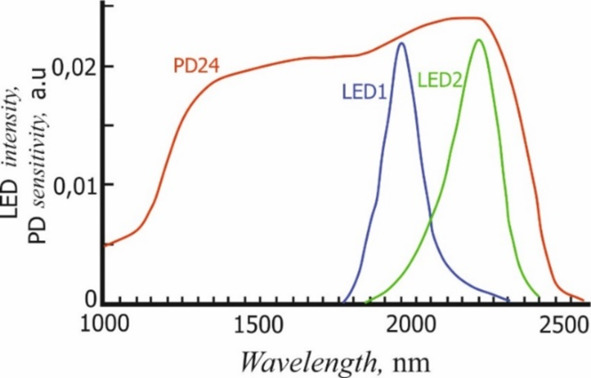 В оптоэлектронном устройстве использованы в качестве излучающего диода на опорной длине волне светодиоды на основе GaAlAsSb/GaInAsSb/ GaAlAsSb (2.2 мкм), а излучающего диода на измерительной длине волны светодиоды на основе GaAlAsSb/GaInAsSb/GaAlAsSb (1.94 мкм).