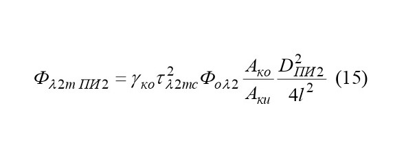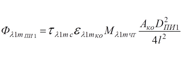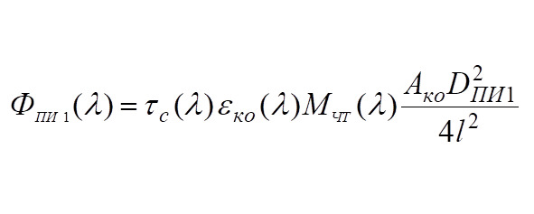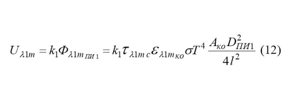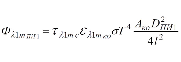 где: τc (λ) – спектральный коэффициент пропускания атмосферы; Mко (λ) – спектральная плотность энергетической светимости, излучающая поверхности контролируемого объекта; Ако – площадь излучающей поверхности контролируемого объекта; DПИ1 – диаметр входного зрачка первого приемника излучения; l – расстояние между контролируемым объектом и первым фотоприемником.