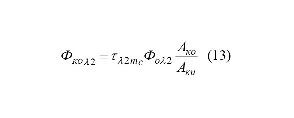 где Аки – площадь поперечного сечения коллимированного излучения; τλ2mc – коэффициент пропускания атмосферы на длинах волн λ2m; Фоλ2 – начальный поток коллимированного излучения. При этом отраженный поток от поверхности контролируемого объекта 1 определяется как: