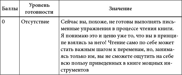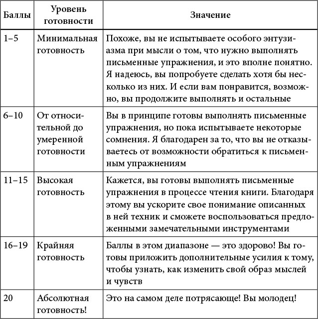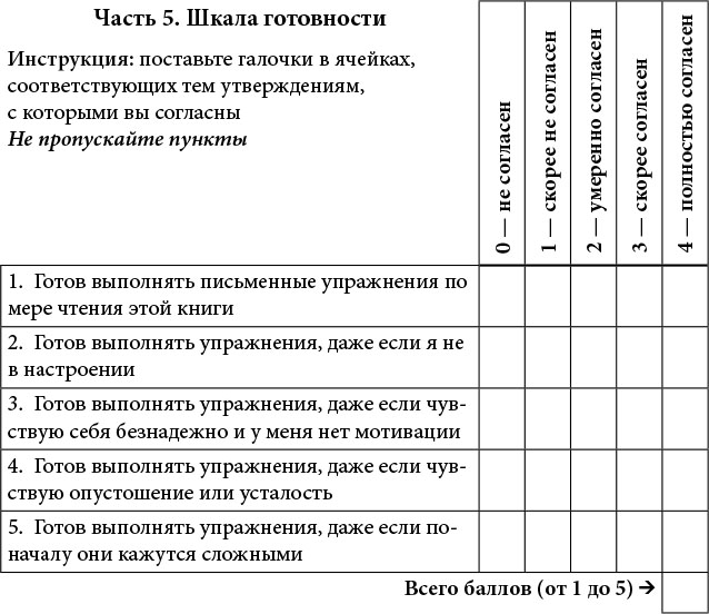 Так что если вы хотите изменить образ своих мыслей и чувств, если вы хотите стать счастливее, то вам нужно будет обязательно выполнять упражнения по мере чтения этой книги. Хотите ли вы их выполнять? Давайте узнаем. Заполните шкалу готовности, которая приведена ниже.