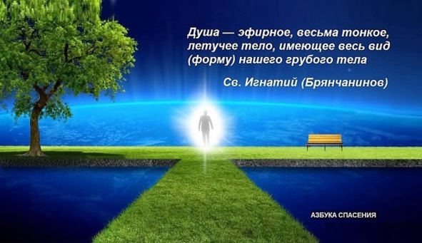 Душа – эфирное, весьма тонкое, летучее тело, имеющее весь вид нашего грубого тела, все его члены, даже волосы, его характер лица, словом полное сходство с ним. Святитель Игнатий (Брянчанинов)