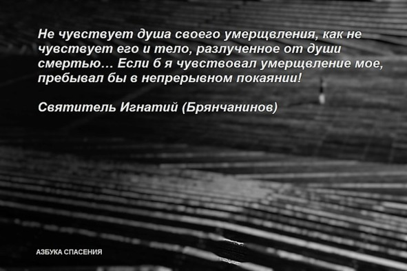 Не чувствует душа своего умерщвления, как не чувствует его и тело, разлученное от души смертью. Святитель Игнатий (Брянчанинов)