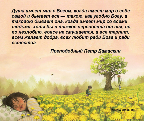 Душа имеет мир с Богом, когда имеет мир в себе самой и бывает вся – такою, как угодно Богу, а таковою бывает она, когда имеет мир со всеми людьми, хотя бы и тяжкое переносила от них… Преподобный Петр Дамаскин