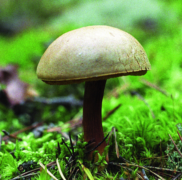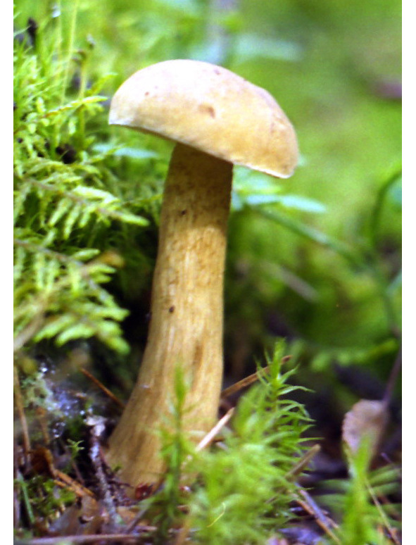 Красивых грибов немало, но этот моховик один из самых эффектных, особенно в молодом возрасте. Шляпка выпуклая, у самых молодых полу-шаровидная, слегка бархатистая, светло-коричневая или темно-желтая, ножка – охристая, немного светлее шляпки, на вид слегка ребристая, расширенная к основанию, трубчатый слой очень мелкопористый, темно-коричневый, «табачного» цвета, как пишут в определителях. Цвет, как шляпки, так и трубчатого слоя, под влиянием освещенности, почвы и погоды, может меняться в широких пределах – от ярко-желтого до коричневого.
