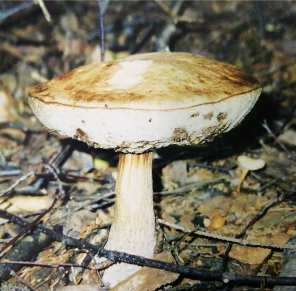 Подберезовик бархатистый или чернеющий иногда весь одноцветный – коричневато-желтый, но встречается и с темно-коричневой шляпкой. Ножки, покрытые мелкими чешуйками, даже у молодых грибов тонкими не бывают, поэтому самые мелкие грибы напоминают желуди – шляпки хоть и не прижимаются краями к слегка вздутым ножкам, но не сильно отличаются от них диаметром. С возрастом ножки вытягиваются, чешуйки становятся почти незаметными, шляпки разрастаются, но остаются выпуклыми и слегка бархатистыми (шершавыми). Из-за довольно толстых плотных ножек и очень темных шляпок можно принять их за подберезовики черные. Однако отличие очень явное – у черного срез слегка синеет, а у бархатистого — чернеет.