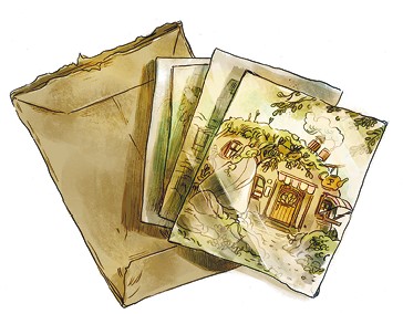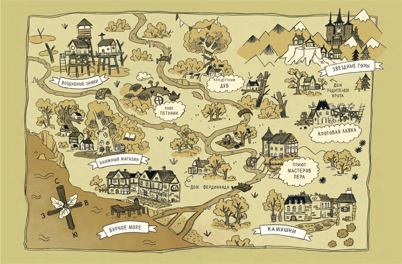 Потрясённый крот достал из кармана второй клетчатый носовой платок и высморкался так громко, будто в магазине заиграла труба: «Бууу! Бууу!». При каждом таком звуке на полках, словно колокольчики, начинали позвякивать готовые в любой момент упасть и разбиться вдребезги безделушки. Арчибальд был готов ловить их в случае необходимости. Но Крот Фердинанд, продолжая всхлипывать, начал развязывать узелки на верёвке, которая удерживала половинку ореховой скорлупы у него на спине. В эту скорлупу крот складывал все книги, которые ему случалось купить, а также всё, что попадалось по пути. Порой от этой скорлупы исходили довольно своеобразные запахи – в особенности, когда Фердинанд по нескольку дней подряд забывал вынуть из неё свой бутерброд или недостаточно плотно закрывал банку со сливовой настойкой. На сей раз он достал из своего рюкзака пожелтевший от времени конверт и обрывок бумаги. И, клянусь самыми вкусными яблоками, ни то, ни другое не пахло прокисшими сливами!