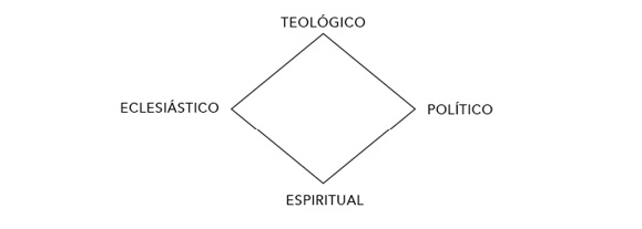 Para explicarlo, se puede recurrir a la figura del paralelogramo. Si se quisiese expresar haciendo referencia a entidades inmateriales, sería preciso colocar sobre dos extremos horizontales las dimensiones de ordenamiento de tipo eclesiástico y de tipo político. En los otros dos extremos verticales deberían figurar las elaboraciones doctrinales y, en el lado opuesto, aquellas espirituales en las que se asientan instancias proféticas e intuiciones anticipadoras.