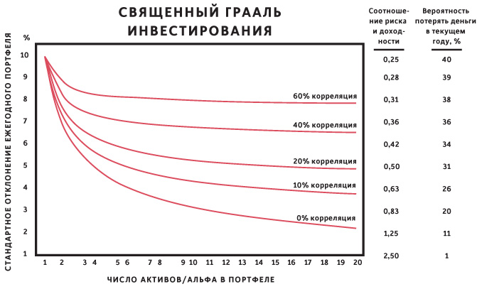 При виде этой простой диаграммы я испытал, вероятно, то же, что почувствовал Эйнштейн, когда он вывел свою знаменитую формулу E = mc2. Было очевидно, что, имея от 15 до 20 качественных, сбалансированных и не коррелирующих друг с другом позиций, я мог значительно уменьшить риски без снижения ожидаемой доходности. Все было предельно просто, но могло бы стать настоящим прорывом, если бы теория подтвердила свою эффективность на практике. Я назвал этот метод Священным Граалем инвестирования, потому что он указывал путь к состоянию. Это был еще один ключевой момент в нашем образовании.