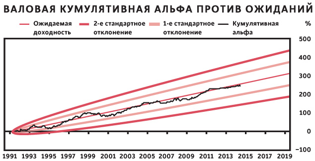Мы также представили несколько других, новых и эффективных способов управления инвестициями, которые работали в точности так, как мы задумали. С каждым из таких инструментов мы предлагали клиентам конкретные расчетные показатели ожидаемой эффективности в формате диаграммы, на которой была приведена прямая нераспределенной прибыли и прогнозируемые вариации. Мы могли это делать благодаря тому, что систематизация нашего процесса принятия решений позволяла проверять его результативность в самых разных условиях.