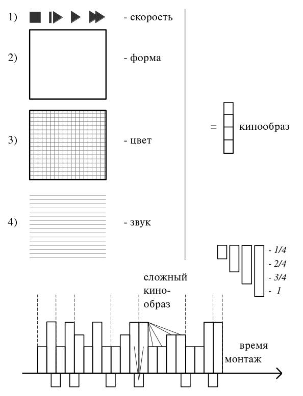 Кинообраз характеризуется скоростью, формой, цветом и звуком.