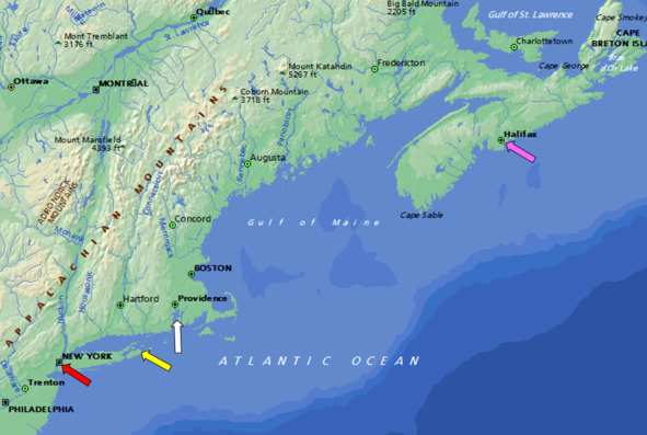 Нью-Йорк (красная стрелка), залив Наррагансетт (белая стрелка), остров Лонг-Айленд (желтая стрелка), Галифакс (сиреневая стрелка)