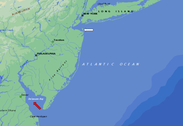 Сэнди-Хук (белая стрелка), устье реки Делавэр (красная стрелка)