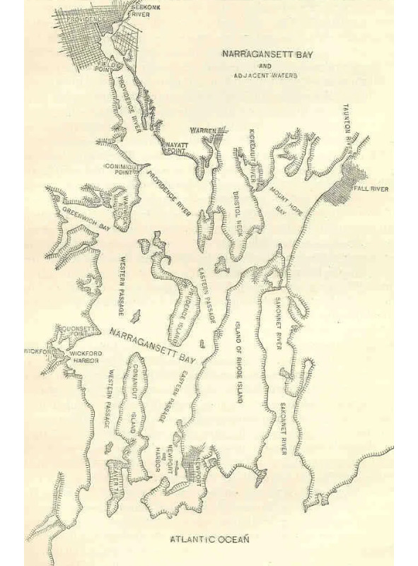 В заливе Наррагансетт есть несколько островов. Двумя крупнейшими у моря являются Род-Айленд и Конаникут, причем последний является самым западным. Их общее направление, как и самого залива, – с севера и на юг; и ими залив разделен на три прохода. Из них восточный, называемый Сиконнет, не судоходен выше Род-Айленда. Центральный проход, который является главным каналом, соединяется с западным выше Конаникута, и, таким образом, оба ведут к вершине залива. Город Ньюпорт находится на западной стороне Род-Айленда, в четырех милях от главного входа.