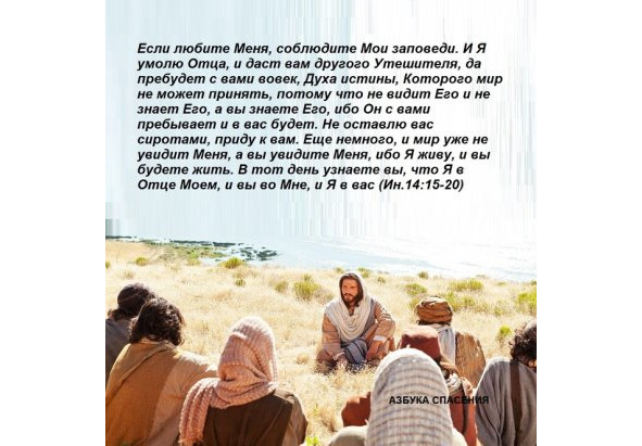 Не оставлю вас сиротами, приду к вам. Еще немного, и мир уже не увидит Меня, а вы увидите Меня, ибо Я живу, и вы будете жить. В тот день узнаете вы, что Я в Отце Моем, и вы во Мне, и Я в вас. Кто имеет заповеди Мои и соблюдает их, тот любит Меня, а кто любит Меня, тот возлюблен будет Отцем Моим, и Я возлюблю его и явлюсь ему Сам. Иуда – не Искариот – говорит Ему: Господи! что это, что Ты хочешь явить Себя нам, а не миру? Иисус сказал ему в ответ: кто любит Меня, тот соблюдет слово Мое, и Отец Мой возлюбит его, и Мы придем к нему и обитель у него сотворим. Нелюбящий Меня не соблюдает слов Моих, слово же, которое вы слышите, не есть Мое, но пославшего Меня Отца. Если любите Меня, соблюдите Мои заповеди. И Я умолю Отца, и даст вам другого Утешителя, да пребудет с вами вовек, Духа истины, Которого мир не может принять, потому что не видит Его и не знает Его, а вы знаете Его, ибо Он с вами пребывает и в вас будет (Ин.14:15—24).
