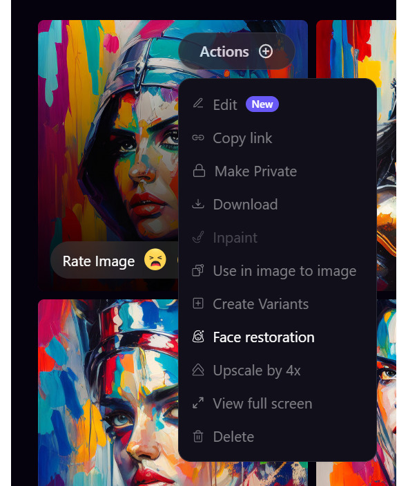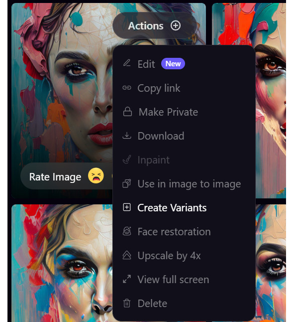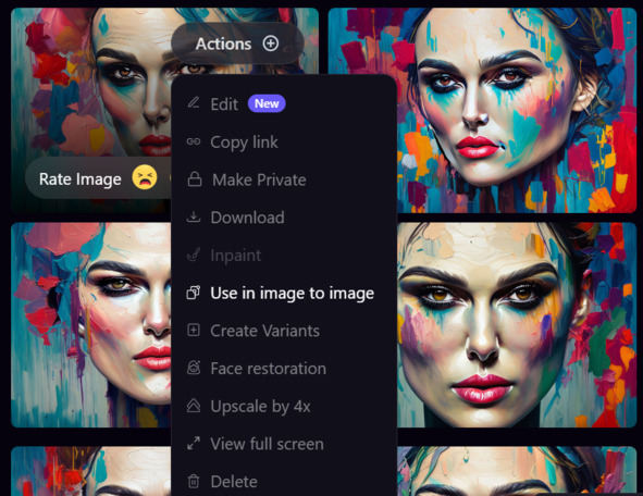 Допустим мне понравилась картинка, но мне на ней что – то не нравится. Я кликаю Actions и выбираю Inpaint и закрашиваю все, что нужно убрать. Он не трогает всю картинку, а убирает только то, что закрасила. Можно менять лицо, только нужно указать в запросе на кого.