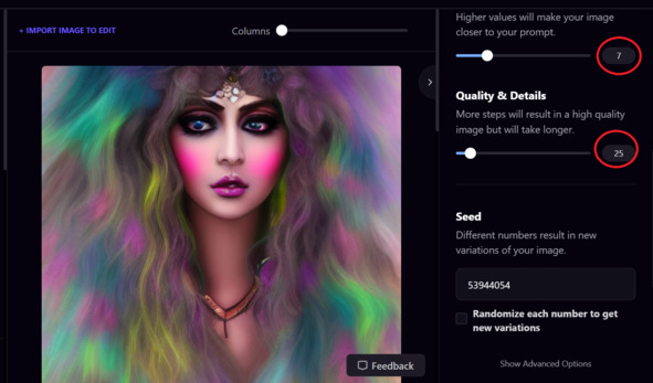 Если я эту картинку беру за основу т учитывается не только то, что я написала, но и эта картинка. Здесь есть еще Шкала ориентиров -это обозначает на сколько он должен следовать тому, что написано, но это влияет на контрастность картинки, чем выше показатель, тем более контрастная и более четко придерживается запросу.