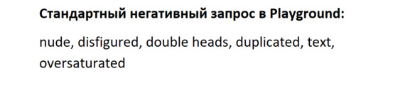 Слово text – чтобы она ничего не писала, а также слово nude, чтобы не было обнаженных картинок. PlaygroundAI все равно их не покажет и будет ругаться, что запущена система безопасности.