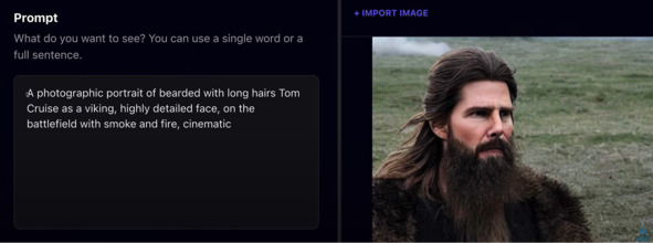 Я его сейчас разберу. Здесь написано: фотографический портрет, бородатого с длинными волосами Тома Круза в качестве викинга, высоко детализированное лицо, на поле боя с дымом и огнем, кинематографическая.