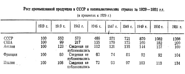 Как видно из приведенной таблицы, объем промышленного производства в СССР в 1951 году составил 1.266 процентов по отношению к 1929 году, то есть увеличился за этот период почти в 13 раз; советская промышленность в послевоенный период, как и до войны, неуклонно идет по восходящей линии, на основе развития мирного производства.