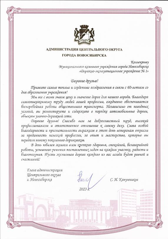 Мне хотелось бы поздравить весь коллектив ДЭУ-1. Я считаю, во всей коммунальной нагрузке, которую несут наши городские службы, это предприятие отвечает за наиболее важный и уязвимый участок. Нагрузка колоссальная. Там работать просто тяжело! И я с огромным уважением отношусь к людям, которые там трудятся, выполняют свои обязанности перед городом. И за это хотелось бы сказать спасибо коллективу и всем сотрудникам. Всем! От ИТР, руководителей, до водителей, механиков – тех, кто обеспечивает обслуживание и выход техники на улицы – до работников ручного труда, ведь есть у нас места, где пока ручной труд заменить пока не удаётся. Всех хочу поблагодарить и поздравить с юбилеем, поздравить с прохождением очередного сложного зимнего сезона. Впереди летний сезон, а значит переоборудование техники, перенастраивание. Хотел бы пожелать успеха работникам нашего ДЭУ в решении очень сложных задач по повышению комфортности проживания в центральной части города Новосибирска!