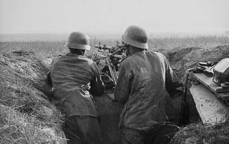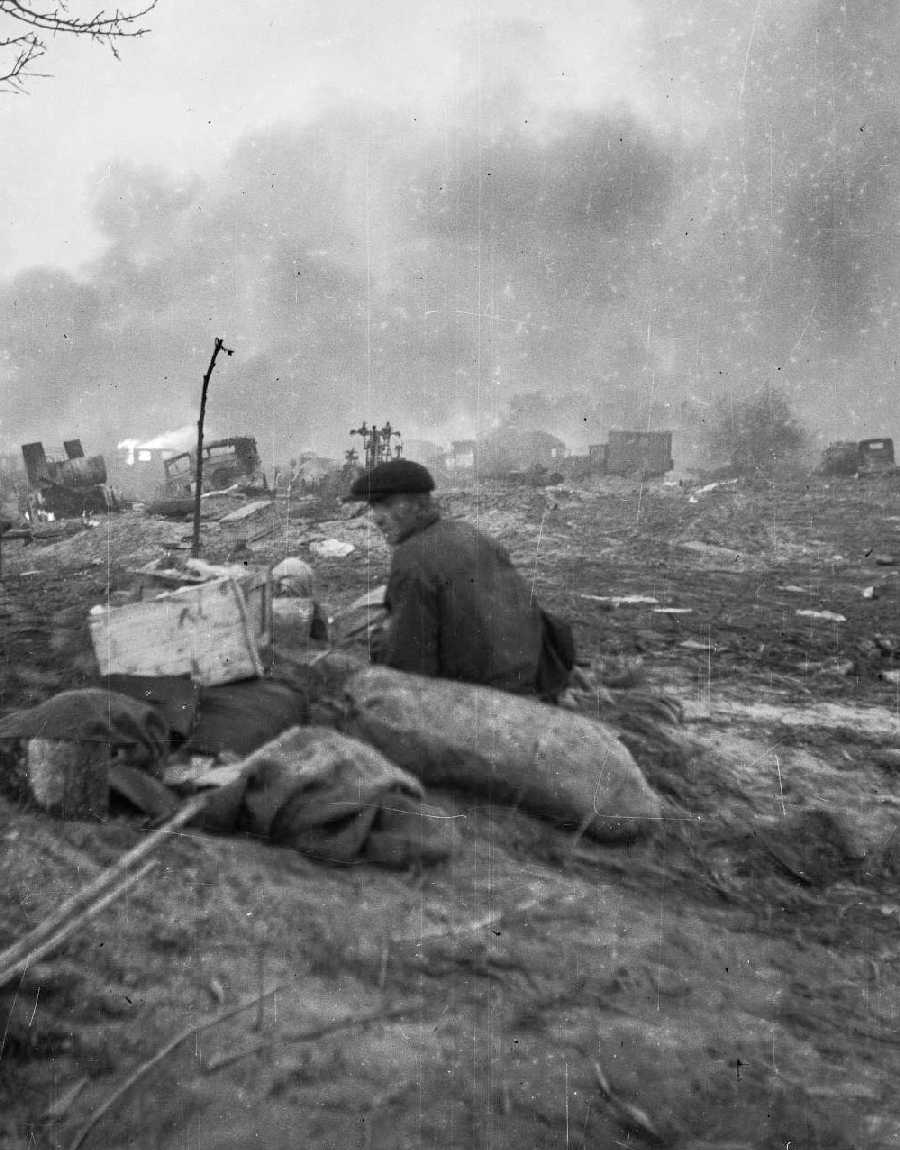 Первый залп нашей артиллерии. Вспышки огня. Мы бежим вперёд через болота и канавы. Мы в грязи по колено. Русские ведут заградительный огонь, визжат пули. Мы не понимаем, куда бежать, – невозможно установить связь под постоянными обстрелами. Мы непрерывно меняем позиции, прижимаемся к земле. Радиста ранило. Шишки и песок в траншеях, грязь в маленьких болотцах. Горящие машины. Горящие вышки.