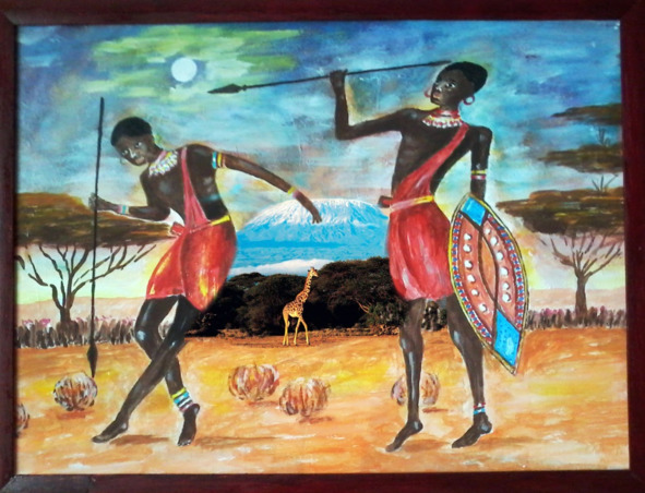 Делаю набросок африканского пейзажа. Представляю картину опаленной экваториальным солнцем жизни «черного» континента. Два воина в ярком убранстве застыли в воинственной позе на фоне снежной вершины Килиманджаро. В руках копья, направленные на мнимых врагов, затерянных за левым углом холста. Взгляды темнокожих воинов суровые, позы решительные. Вот-вот они покинут ограниченные размеры полотна, и решительно, без какого-либо страха ринуться в бой. На заднем плане картины, вытянув пеструю шею, щиплет высокие листья красавец-жираф.
