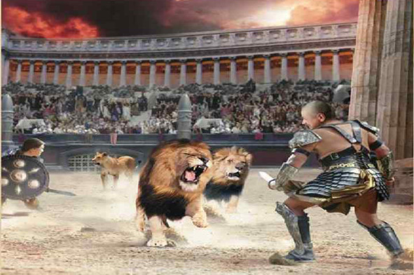 Однажды Грэта-Глория случайно настроила телевизионный приемник на частоту, отличающуюся на один процент от требуемой, и не поверила своим глазам. На экране монитора секунд десять мелькали живые картинки с какими-то историческими баталиями между отдельными группами облаченных в железные доспехи людей; жуткими схватками хищников с безоружными людьми; трибунами, наблюдающими за этими страшными сценами.