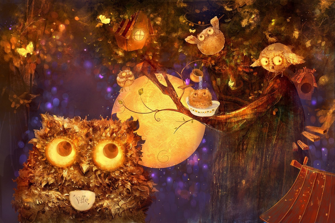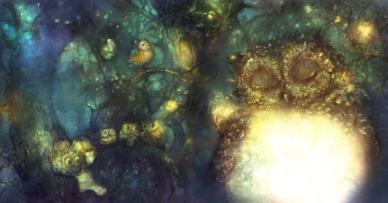 Жил-был в Городе-на-Дереве совенок-поваренок. Кроме него, там обитали совы-стражники, совы-старейшины, совы-учителя и совы-неучи, совы-папы и совы-мамы. Все они страшились тьмы, что скрадывала по ночам землю и никогда не приближались к ней (днем совы, конечно, спали, и она тоже спала). Совенок-поваренок боялся этой тьмы больше всех, а потому его дупло приютилось на самой-самой высоте. Над ним были только верхушки деревьев и звезды, и он часами любовался, как ветви покачивались, поскрипывали в ночи и то открывали, то скрывали усеянное искрами небо. Когда перед рассветом веки поваренка тяжелели, он варил кофе, говорил «бррлмррр» и встряхивал крыльями. Сон отступал, звезды таяли в солнечном сиянии, и утренние лучи окрашивали круглые окошки и круглые дверцы Города-на-Дереве в розово-оранжевый цвет.