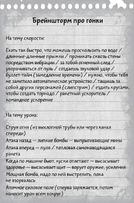 Обдумайте, чего вы хотите от игры. Запишите эти мысли. Ваша цель – набросать столько свободных ассоциаций, сколько сможете. Выдоите идею до конца. Когда дойдете до полного бреда, попробуйте сжать ее еще разок – и только тогда отпускайте. Вот, например, часть заметок с одного брейншторма, в котором я участвовал: