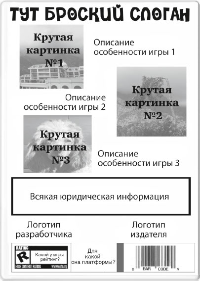Отличное упражнение для брейншторма – придумать упаковку игры и руководство к ней. Что будет на обложке? А на обороте? Как вы передадите суть игры в черно-белом руководстве на шестнадцать страниц? Наложив на свои замыслы эти ограничения, вы профильтруете их до самых основ. Вот пример обратной стороны обложки, которым можно пользоваться: