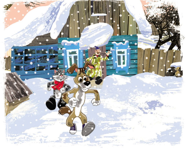 Матроскин, Шарик и Печкин на улицу выскочили. На улице красиво. Снежинки падают, каждая размером с блюдце. Такие красивые, хоть в холодильник складывай. Солнце заходящее снег золотит. И мороз не очень сильный – тридцать градусов всего. И дрова лежат берёзовые под навесом! Благодать!