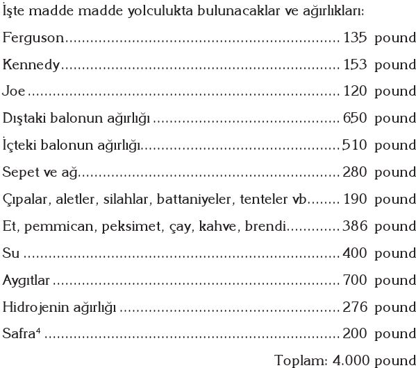 “Evet, aynı zamanda bir insan da! Bir balon onu çevreleyen havaya karşı hareketsizdir; hareket eden balonun kendisi değil çevresindeki havadır. Mesela, bir balonun sepetinde bir mum yakın, alevinin titreşmediğini görürsünüz. Garnerin’nın balonunda olan bir kişi, hızdan azıcık da olsa etkilenmeyecekti. Fakat benim zaten böyle bir hıza çıkmak gibi bir niyetim yok ve eğer bir ağaca ya da bir yükseltiye demirlemeyi başarırsam bu söylediğimden geri kalmayacağım. Ayrıca, yanımızda iki aylık erzak götürüyoruz ve ihtiyaç anında yetenekli avcımızın bize çeşitli av etleri sunmaması için de herhangi bir sebep yok.”