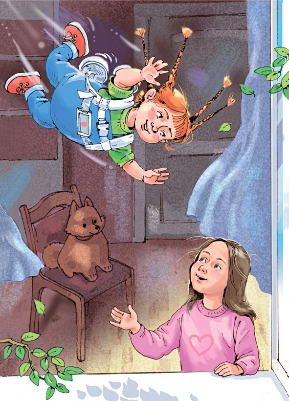 Ее пропеллеры работали громче, чем винты плюшелета. Микаэла уселась на диск верхом, крепко вцепилась в канат, точно как в парке, и они обе мигом вылетели в окно. Раз – и они уже стояли напротив плюшелета. Микаэла вся светилась от предвкушения необычайного приключения! Правда, она не предупредила Настю, но та все равно спала.
