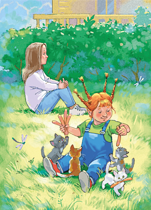 – Ну, как хочешь! – Плюша и котята радостно выскочили на лужайку, причем косички Плюши торчали точно так же, как хвосты котят. Четыре косички и четыре хвостика (Микаэла даже немного приревновала своих котят к Плюше) уселись на траву и в мгновение ока расправились с сосисками, потом развалились на солнышке и блаженно закрыли глаза. Микаэла тоже зажмурила глаза, только не от сосисок из стрекозы, а от того, что у нее страшно зачесался нос и она усиленно им крутила. Все происходящее никак не вписывалось в ее картину мира! Еще утром она сидела в своей комнате и тосковала по померанскому шпицу, а к обеду уже произошло столько приключений… И что-то подсказывало ей, что это только начало.