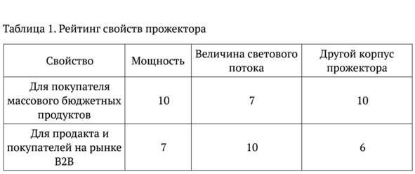 Будем считать, что потребителей продукта можно разделить на группы, которые имеют определенный бюджет для покупки, обладают определенными знаниями о продукте, опираясь на которые выбирают продукт среди множества конкурентов на рынке. Мы должны понять, какие свойства прожектора влияют на выбор покупателя, а какие не имеют особого значения.